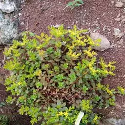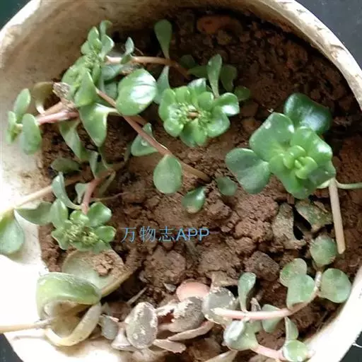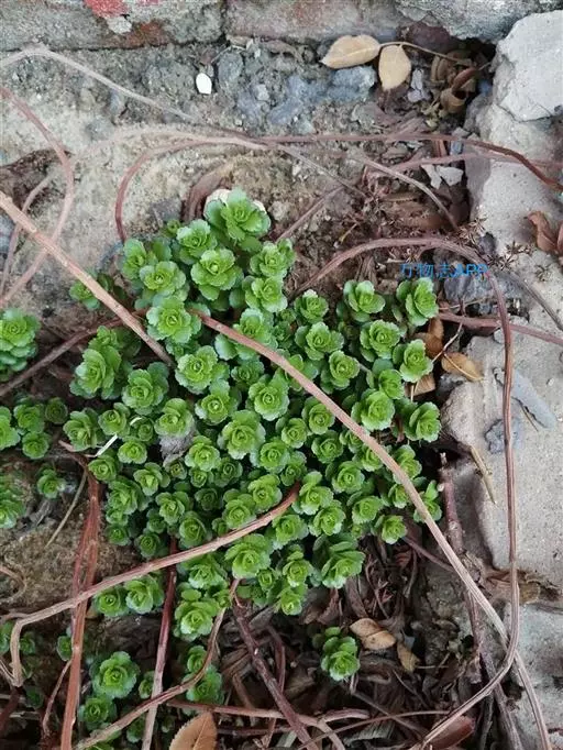 凹叶景天(拉丁文名:Sedum emarginatum Migo)别名:石板菜、九月寒、打不死、石板还阳、石雀还阳、岩板菜,.景天科景天属多年生草本植物。茎节的下部平卧于地面或地下、节上生有不定根;上部直立,淡紫色,略呈四棱形;叶片顶端圆而且有一个凹陷;枝叶密集如地毯,花较小,黄色,着生在花枝的顶端。花期5-6月,果期6月。室外越冬时部分叶片紫红色。耐旱,喜半阴环境。产云南、四川、湖北、湖南、江西、安徽、浙江、江苏、甘肃、陕西、福建等地。生于海拔600-1800米处山坡阴湿处。全草药用,可清热解毒,散瘀消肿,治跌打损伤、热疖、疮毒等病症。