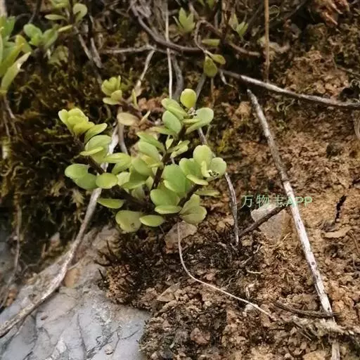 多年生草本。茎细弱,高10-15厘米。叶对生,匙状倒卵形至宽卵形,长1-2厘米,宽5-10毫米,先端圆,有微缺,基部渐狭,有短距。