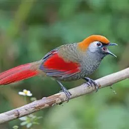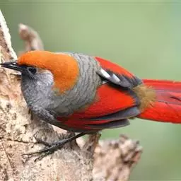 赤尾噪鹛中型鸟类,体长24~28厘米。头顶至后颈红棕色,两翅和尾鲜红色,眼先、眉纹、颊、颏和喉黑色,…