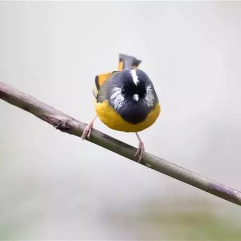 黄喉噪鹛体型略小,顶冠蓝灰色,特征为具黑色的眼罩和鲜黄色的喉。上体褐色,尾端黑色而具白色边缘,…