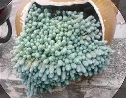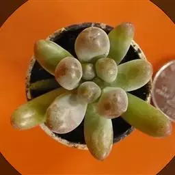 叶匙形,互生,排列成莲座状;表面光洁,正面平坦,背面微微隆起,肉质厚实,翠绿色或嫩绿色,叶面上被白粉,并透出密布的极细微的白色颗粒。在光照充足、温差大的环境下,叶尖会出现美丽可爱的小红点,叶色变为果冻般的浅绿色或黄绿色,犹如凝冻通透、弹吹欲破的玉脂。