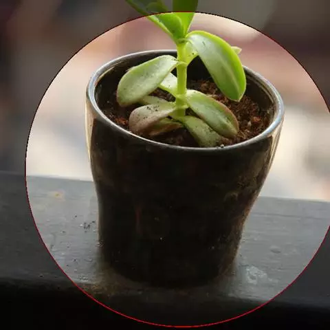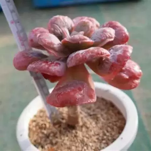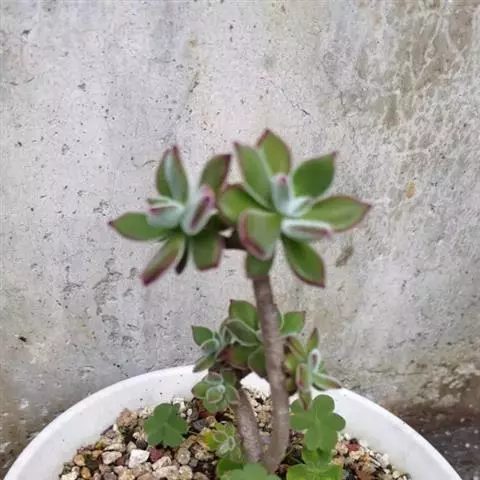 花椿为景天科青锁龙属一种多年生常绿肉质开花植物,茎直立,株高通常15厘米以内,易群生;叶交互对生,抱茎,肉质,叶片内凹像掏空的半球,顶叶互相包裹外观呈球形,叶绿色至褐红色,基部红色,叶缘有密集短毛,叶面有比较密集的深褐红色点;小花白色,钟形,顶端外翻。