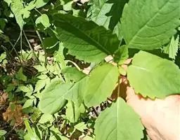 叶互生,具短柄,在上部较密集;叶片坚硬,披针形或卵状披针形,或卵状长圆形,长5-12厘米,宽1.5-2.5厘米,顶端渐尖,基部狭成短叶柄或近无柄,边缘具圆齿状锯齿或细锯齿,齿端具小尖,齿间有刚毛.侧脉6-8对,上面绿色;下面浅绿色或干时变紫色;叶柄长5-15毫米,基部具1对具柄的腺体。