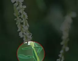 头状花序腋生,直径约3厘米(连花丝),有花约25-40朵,总花梗长1-3.5厘米;花萼钟状,长约2毫米,绿色;花冠管长3.5-5毫米,淡紫红色,顶端具5裂片,裂片反折,长约3毫米,无毛;雄蕊突露于花冠之外,非常显著,雄蕊管长约6毫米,白色,管口内有钻状附属体,上部离生的花丝长约2厘米,深红色。荚果线状倒披针形,长6-11厘米,宽5-13毫米,暗棕色,成熟时由顶至基部沿缝线开裂,果瓣外反;种子5-6颗,长圆形,长7-10毫米,宽约4毫米,棕色。 [2-3] (红粉扑花的大小与株樱花相近)