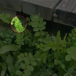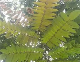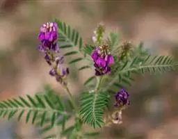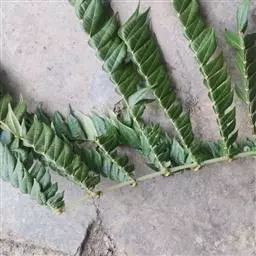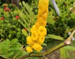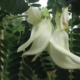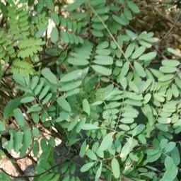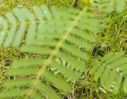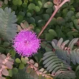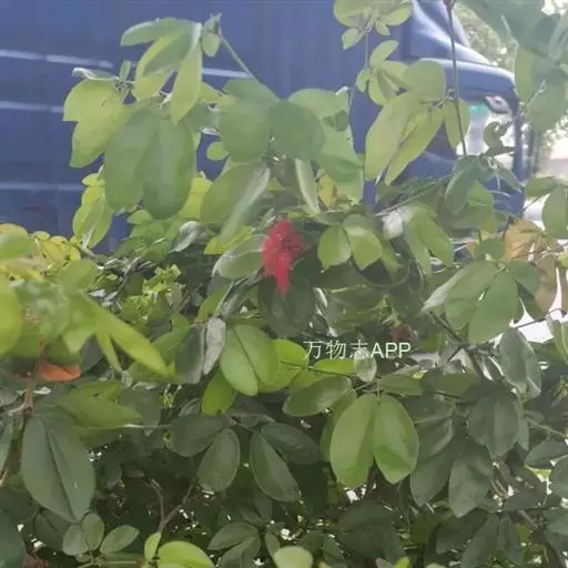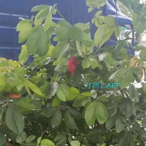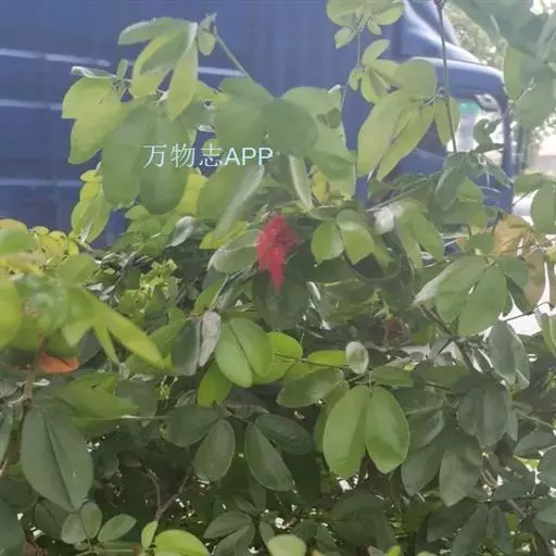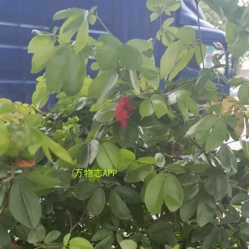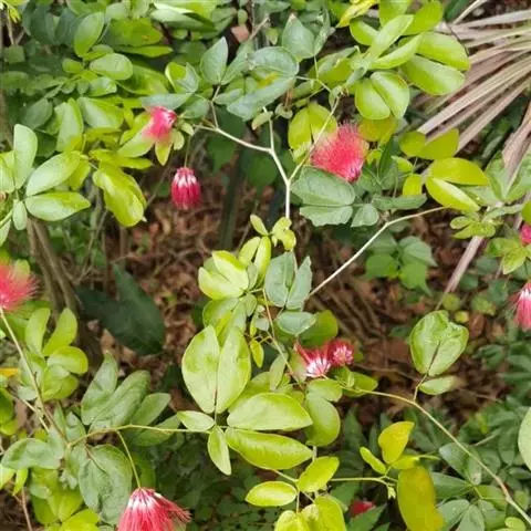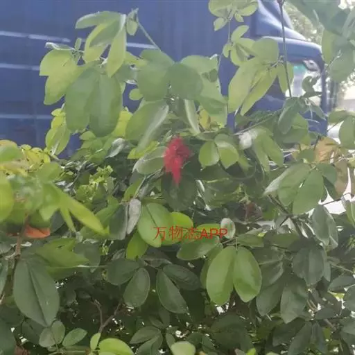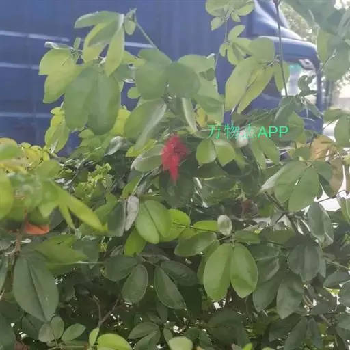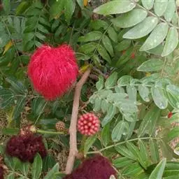 红粉扑花 半落叶灌木,高1-2米;枝条扩展,小枝圆柱形,褐色,粗糙。托叶卵状披针形,宿存。二回羽状复叶(互生),具有1对羽片,而其小叶只有1对,其形状如肾脏形。边缘被疏柔毛;中脉略偏上缘;小叶柄长仅1毫米。总叶柄长1-2.5厘米;羽片1对,长8-13厘米。