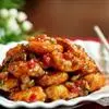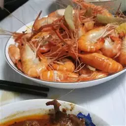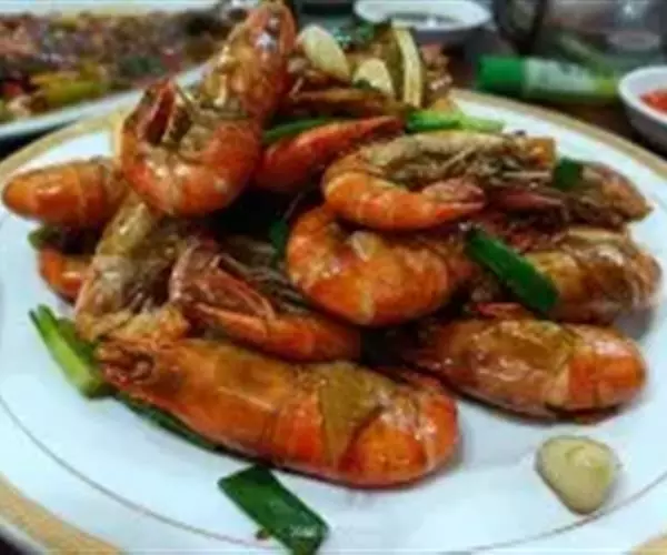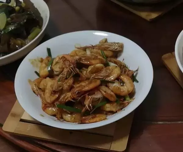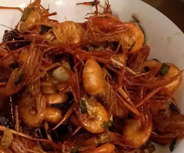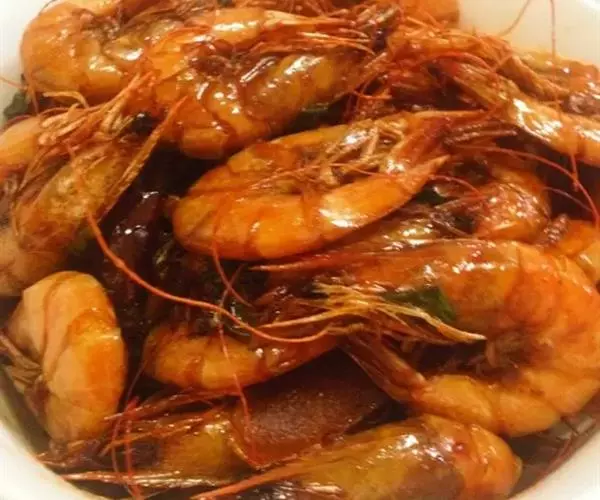此菜酱红色,虾外脆内嫩,带着咸鲜味。