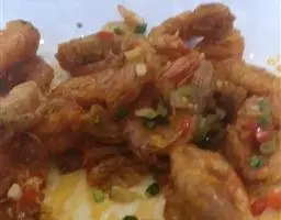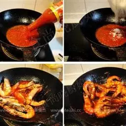 6. 爆香后倒入炸好的虾,迅速翻炒;