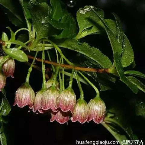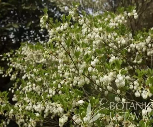落叶灌木或小乔木,高2.6-6米。小枝光滑,无毛;芽鳞12-15}枚,宿存。叶密集枝顶,厚纸质,长圆形或长卵形,长6-8(-11)厘米,宽(2.8-)3.2-3.5(-4)厘米,先端短渐尖或渐尖,基部宽楔形或钝圆,边缘具细锯齿,不反卷,表面无毛,或中脉有微柔毛,背面中脉下部被白色柔毛,中脉、侧脉及网脉在两面明显,在背面隆起;叶柄较纤细,长6-12(-20)毫米,无毛。伞形花序顶生。每花序上有花2-6朵,花下垂;花梗长1-1.5 (-2)厘米,结果时直立,变粗壮,长可达3厘米;花萼绿色,萼片5,三角形;花冠钟形,白绿色,长约1厘米,口部5浅裂,裂片反卷;雄蕊10枚,花丝白色,长约5毫米,下部宽扁并具白色柔毛,花药具2反折的芒;子房圆柱形,5室,每室有胚珠10-15枚,花柱长约5毫米,无毛。蒴果椭圆形,长约1厘米,直径6-8毫米,干后黄褐色,无毛,具棱,顶端有宿存花柱,5裂,每室有种子数粒;种子瘦小,长约2毫米,具2膜质翅。花期4月,果期5-7月。
