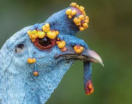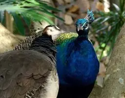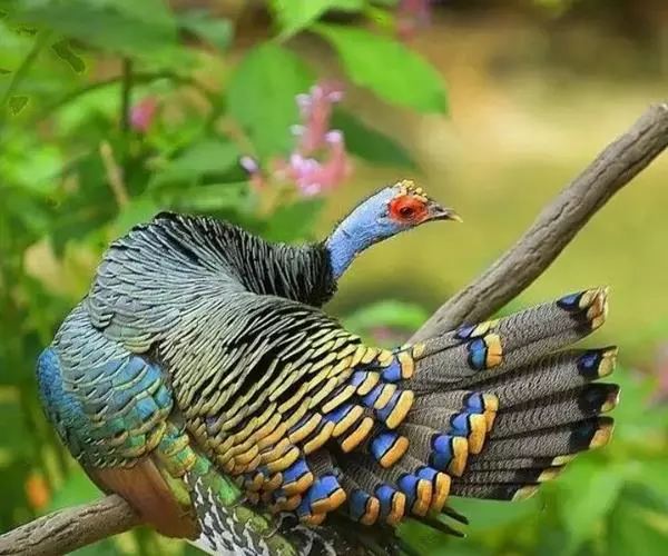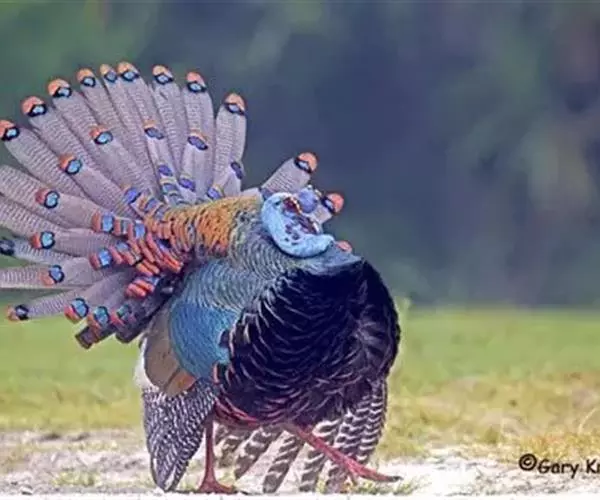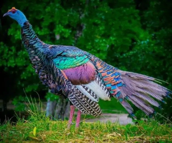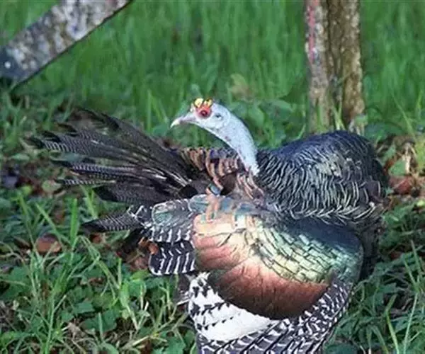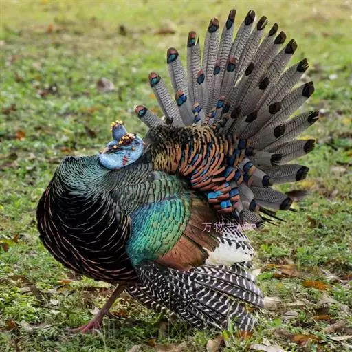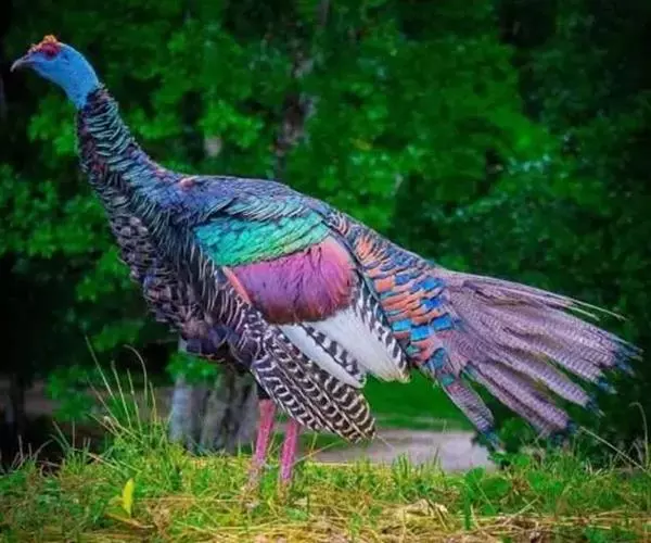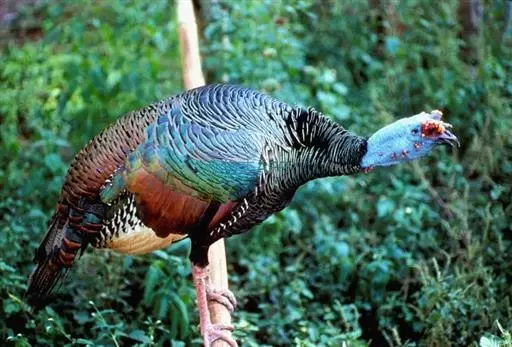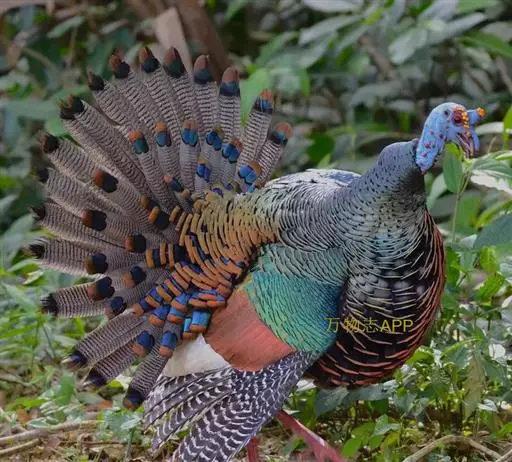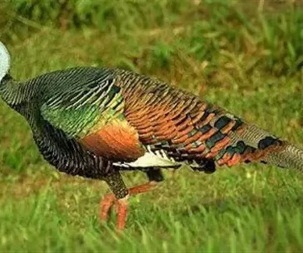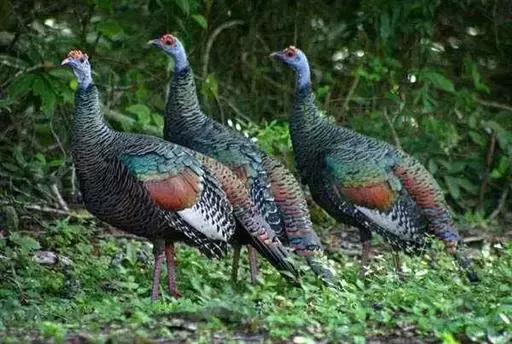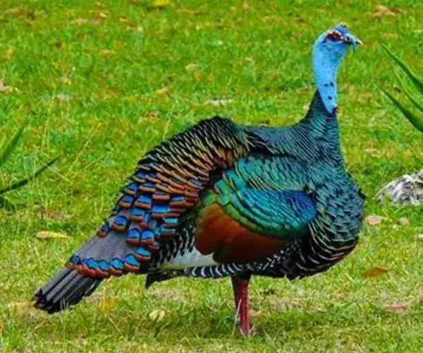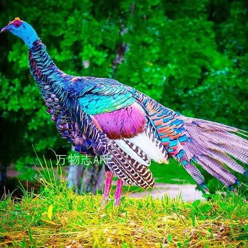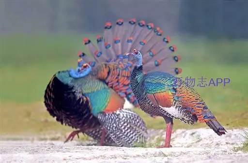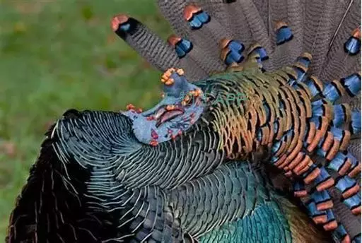 眼斑吐绶鸡(学名:Ocellated Turkey):是火鸡科的两种鸟类之一。体型比普通火鸡略小些,体长1米左右,体重2.4-5.4千克,雄性比雌性略大,长得很特别,蓝色的秃脑袋上冒出几个橙黄色的疙瘩。但是它羽色艳丽,身体呈铜色及绿色。虽然雌鸡较深及绿色,胸部羽毛与雄鸡相似。它们的尾部覆盖看一些眼状的斑点。眼斑吐绶鸡的名字就是这样来的。