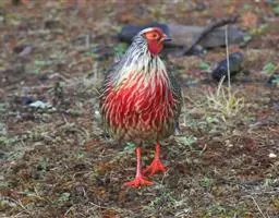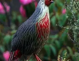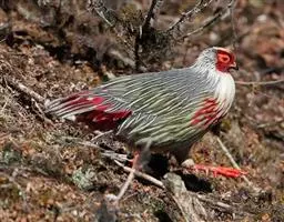 体大的灰褐色鹑类。胸灰色具黑色细纹。与相似种类四川雉鹑不同处在于栗色喉块外缘近白。有猩红色眼周裸皮。…