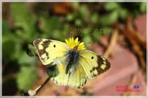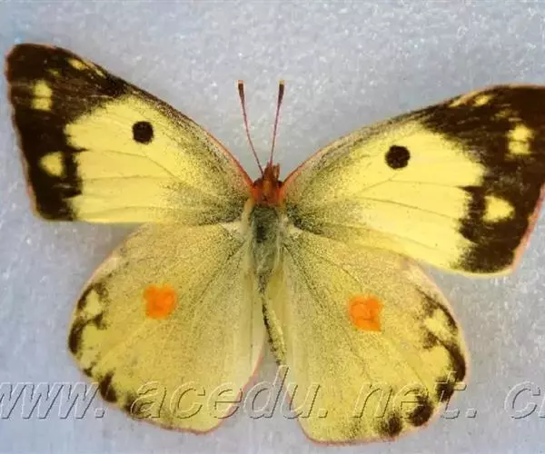 纹黄蝶,翅面黄色,缘毛桃红色;前翅外缘宽的黑边中有几个黄色斑,中室端部有一个黑斑;后翅外缘的黑色斑多连接成列,翅背银白色,且有浅褐色圆圈。成虫体长15—23毫米,翅展45—58毫米,雄成虫翅鲜黄色或橙黄色,前翅外缘1/3部分呈黑色,黑色区有数个大小不等的黄色斑。雌成虫有黄、白二种色型。新疆西北部及乌鲁木齐另有一种豆粉蝶ColiashyaleL.与本种相似,但雄虫翅面淡黄绿色。主要分布在中国广大地区;印度、日本、欧洲东部等。