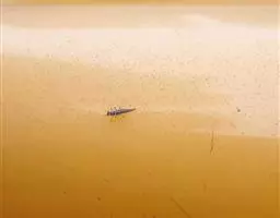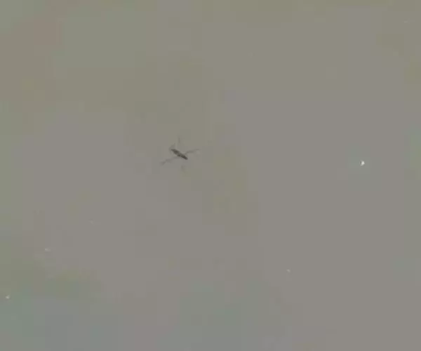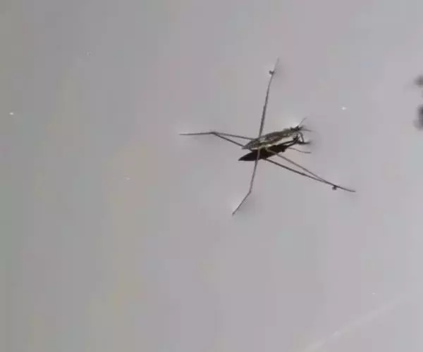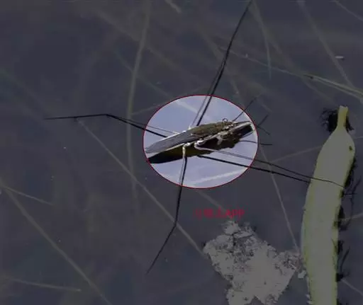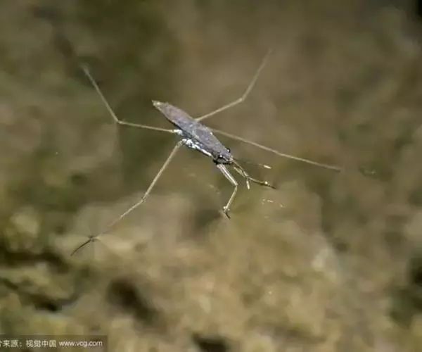 水黾是一种在湖水、池塘、水田和湿地中常见的小型水生昆虫。水黾科昆虫成虫长8至20mm,黑褐色,头部为三角形,稍长。体小 水黾 型至大型,长形或椭圆形。 口吻稍长,分为3节,第2节最长;触角丝状,4节,突出于头的前方。前胸延长,背面多为暗色而无光泽,无鲜明的花斑,前翅革质,无膜质部。身体腹面覆有一层极为细密的银白色短毛,外观呈银白色丝绒状,具有拒水作用。 其躯干与宽黾蝽科类似。它们的躯干非常瘦长,躯干上被极细的毛,这些毛厌水。腹部具明显的侧接缘。