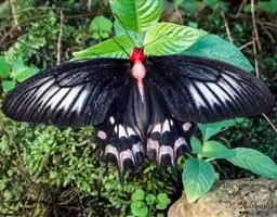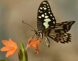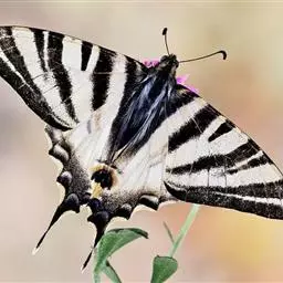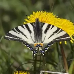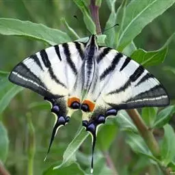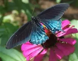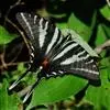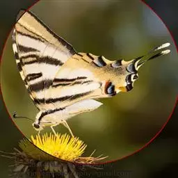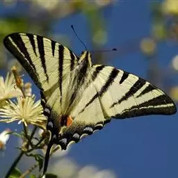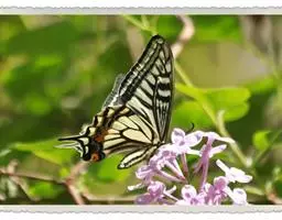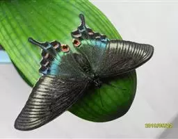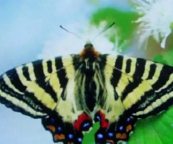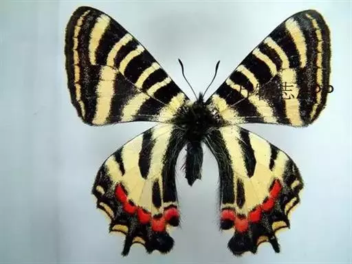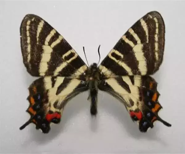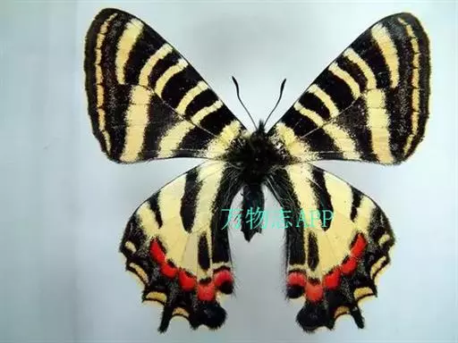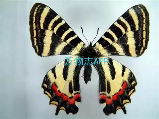 虎凤蝶模式种翼展为3.0-3.5厘米,翅面黄色,有黑色斑纹,翅脉黑色。底部是一个倒置的副本,颜色更为明亮。前翅外缘有宽的黑带,翅面有很多黑色短纹,犹如虎皮,故名。后翅黄色,有一长一短的黑色条纹,外缘波形,黑带上镶有四个弯月形黄斑,黑带的中间嵌有蓝色斑点,最里面一列弯月形红斑。在黄色衬底的前翅上,自前缘向后翅延射着八道如虎斑的粗黑条纹,后翅外缘呈锯齿状。雌蝶比雄蝶略暗。
