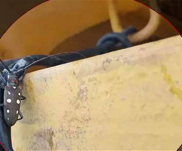 体型粗短,粗糙不平,具金属光泽。体长15~16.5mm,宽7.5~8.3mm。初化之蛹头胸部外观湿润,除翅芽浅绿色外,其余呈浅黄色,以后随着蛹体干燥,色泽逐渐变深,呈红棕色,最后整体呈茶褐色,且质地坚硬。蛹背面:头端有排列整齐的4个突起,其后方有2个突起。胸部远比腹部窄,前胸背板有一倒丫形脊突;中胸宽大、鼓突;后胸较窄,有一细丝围绕在后胸背面;胸部中央有蜕裂线。腹部可见10节,第1~3腹节由窄到宽,第4与第5腹节之间可以上下活动。每一腹节有矩形褐色内凹块5块,中央一块最宽,第一腹节中央凹块两侧有乳白色斑一对。蛹腹面:头部呈长方形;复眼半圆形,位于前方两侧,近触角基部;上唇圆弧形,中央凸出。腹末端强烈向腹面弯曲,与体中轴成直角。