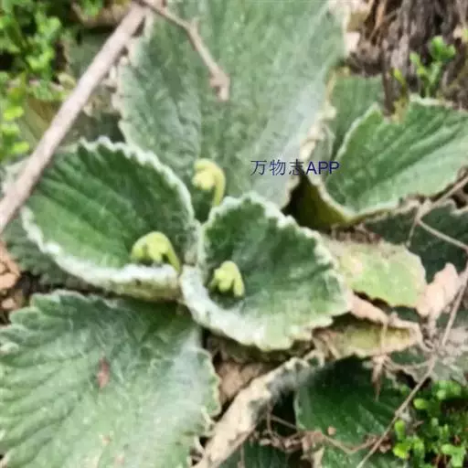多年生草本。叶全部基生,莲座状,无柄,近圆形,圆卵形,卵形,长1.8-7厘米,宽1.2-5.5厘米,上面被白色贴伏长柔毛,下面被白色或淡褐色贴伏长绒毛,顶端圆形,边缘具牙齿或波状浅齿,叶脉不明显。