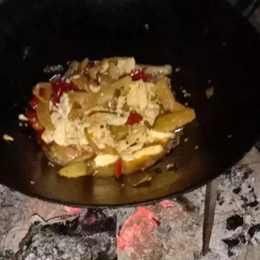 8.加入青蒜、盐翻炒至青蒜将变色即可盛出,倒入锅仔中,放入炉子上边炖边吃。