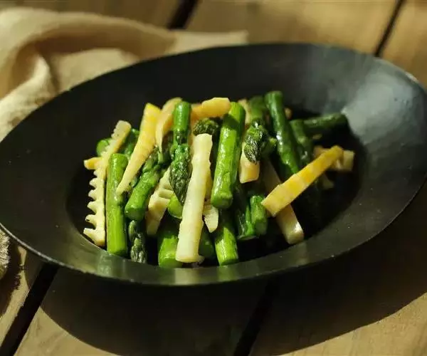 2.入开水锅中焯水一分钟左右,捞出立即用冷水冲淋至完全凉透,沥水备用;