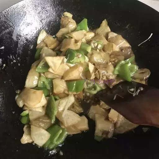 4、再加入秀珍菇和蘑菇炒至磨菇变熟,加适量鸡粉调味;
