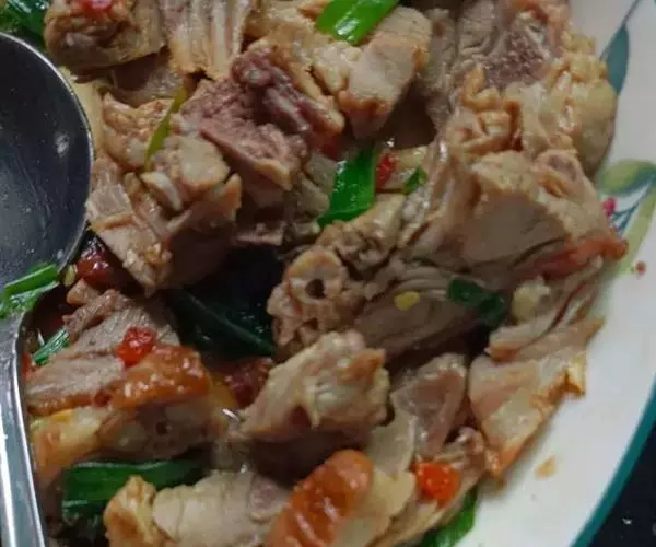 【材料】花菜500克、五花肉50克、肥肉20克、朝天椒、青蒜、蒜瓣、酱油、蒸鱼豉油