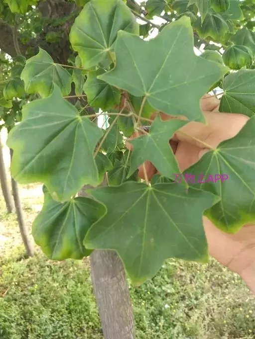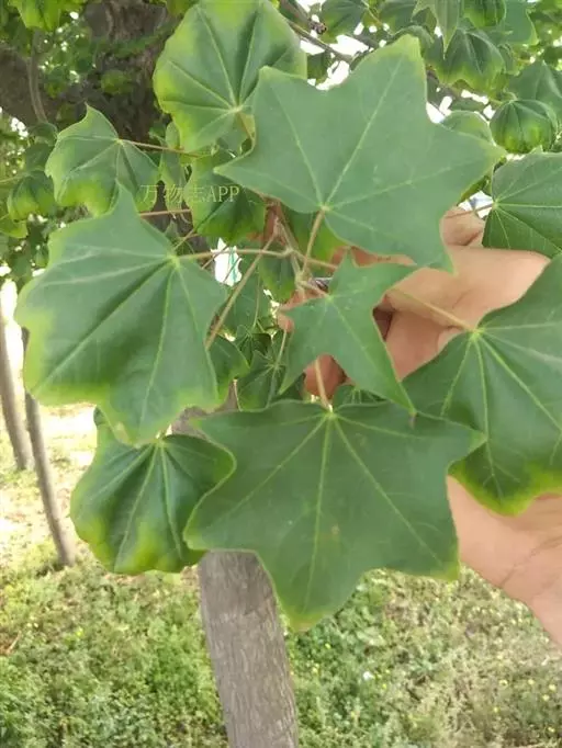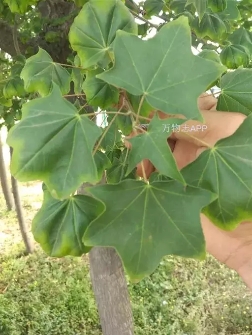 叶纸质,基部截形或近于心脏形,叶片的外貌近于椭圆形,长6-8厘米,宽9-11厘米,常5裂,有时3裂及7裂的叶生于同一树上;裂片卵形,先端锐尖或尾状锐尖,全缘,裂片间的凹缺常锐尖,深达叶片的中段,上面深绿色,无毛,下面淡绿色,除了在叶脉上或脉腋被黄色短柔毛外,其余部分无毛;主脉5条,在上面显著,在下面微凸起,侧脉在两面均不显著;叶柄长4-6厘米,细瘦,无毛。