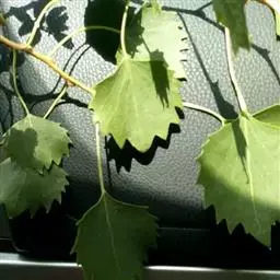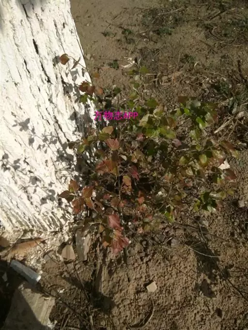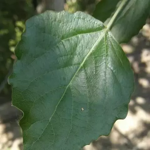 叶三角状卵圆形或近圆形,长宽近等,长3-6厘米,先端钝尖、急尖或短渐尖,基部圆形、截形或浅心形,边缘有密波状浅齿,发叶时显红色,萌枝叶大,三角状卵圆形,下面被柔毛;叶柄侧扁,长2-6厘米。