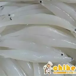 长江间银鱼 长江间银鱼(Hemisalanx brachyrostralis)又称短吻间银鱼,属鲑形目,银鱼科,间银鱼属。俗称:面鱼,面条鱼,鲙残鱼(《本草纲目》)。英文名:Shortnose noodlefish 。体细长,略呈圆筒形,后段较侧扁。头部平扁,呈三角形;口大,吻长而尖。在前上颌骨、上颌骨和口盖上都生有一排细齿,下颌骨前部具犬齿一对,下颌前端具一肉质突起。背鳍位于体后四分之三处,背鳍与尾基的中央有一透明小脂鳍,胸鳍没有肌肉基。体无鳞,雄鱼臀鳍基部两侧各有一行大鳞。生活时体柔软透明,从头背面能清楚地看到脑的形状。浸制标本呈乳白色。体侧各有一排黑点,腹面自胸部起经腹部至臀鳍前有两行平行的小黑点,沿臀鳍基左右分开,后端合而为一,直达尾基。在尾鳍和胸鳍的第一鳍条上也散布有小黑点。平时生活于长江干支流中。以浮游动物为主食。半年达性成熟。1冬龄鱼于4-5月从江河中进入湖泊,在湖边水草丛生地繁殖。亲鱼生殖后个体显著瘦弱,不久便死亡。分布于长江中、下游及其附属湖泊中。个体不大,最大个体长约140毫米,重5克左右,为一年生鱼类。生殖季节形成渔泛,数量极为可观。银鱼口味鲜美,营养丰富,具有特殊风味,特别是产卵前的银鱼最丰美。除鲜食外,多数晒干外销,商品名为“燕干”。干银鱼的蛋白质含量为72.1%,脂肪含量为13%,高于其它食用鱼。每百克银鱼还含赖氨酸4820毫克,蛋氨酸2308毫克,异亮氨酸4176毫克,缬氨酸4396毫克,苏氨酸6652毫克,如此丰富的氨基酸,是其它鱼种所少见的。