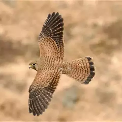 红隼(学名:Falco tinnunculus):是隼科的小型猛禽之一。体重173-335克,体长305-360毫米。翅狭长而尖,尾亦较长,外形和共同爪隼非常相似。雄鸟头蓝灰色,背和翅上覆羽砖红色,具三角形黑斑;腰、尾上覆羽和尾羽蓝灰色,尾具宽阔的黑色次端斑和白色端斑,眼下有一条垂直向下的黑色口角髭纹。下体颏、喉乳白色或棕白色,其余下体乳黄色或棕黄色,具黑褐色纵纹和斑点。雌鸟上体从头至尾棕红色,具黑褐色纵纹和横斑,下体乳黄色,除喉外均被黑褐色纵纹和斑点,具黑色眼下纵纹。脚、趾黄色,爪黑色。