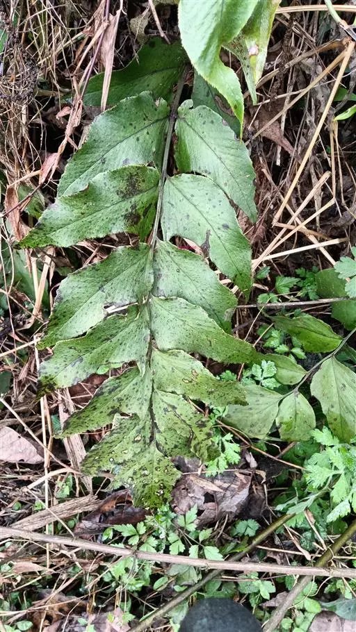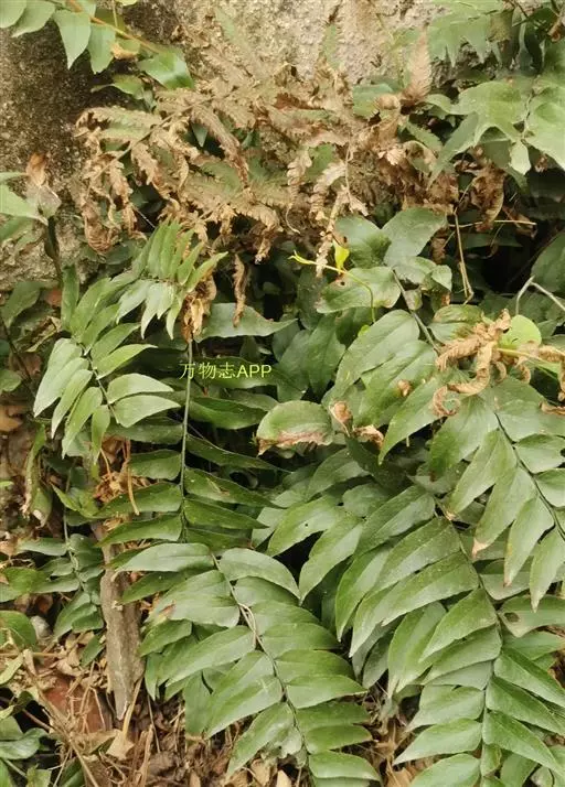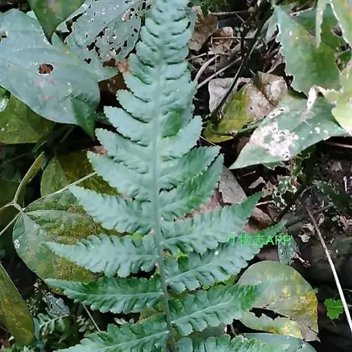 多年生草本,高50~100cm。根茎粗壮,斜生,有较多坚硬的叶柄残基及黑色细根,密被深褐色、长披针形的大鳞片。叶簇生于根茎顶端;叶柄长10~25cm,基部以上直达叶轴密生棕色条形至钻形狭鳞片,叶片草质,倒披针形,长60~100cm,中部稍上处宽20~25cm,二回羽状全裂或深裂;羽片无柄,裂片密接,长圆形,圆头或圆截头,近全缘或先端有钝锯齿;上面深绿色,下面淡绿色,侧脉羽状分叉。孢子叶与营养叶同形,孢子囊群着生于叶中部以上的羽片上,生于叶背小脉中部以下,囊群盖肾形或圆肾形,棕色。