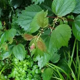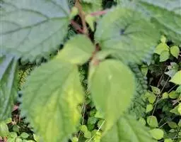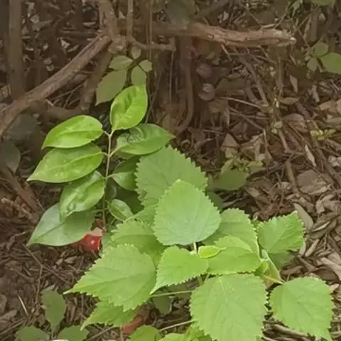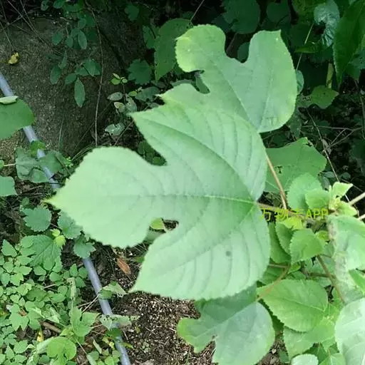 贴毛苎麻(变种) 与苎麻的区别:茎和叶柄只被贴伏的短糙毛,无开展的长硬毛;叶片多为卵形,稀圆卵形,基部突收狭呈楔形;托叶基部合生。