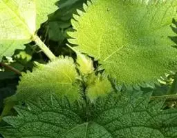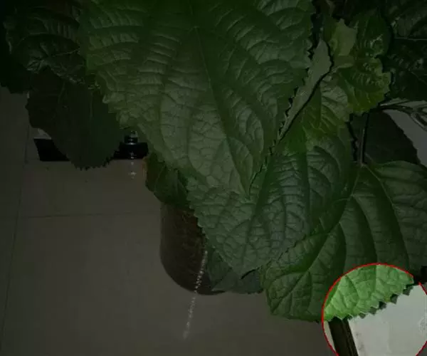 叶互生;叶片草质,通常圆卵形或宽卵形,少数卵形,长6-15厘米,宽4-11厘米,顶端骤尖,基部近截形或宽楔形,边缘在基部之上有牙齿,上面稍粗糙,疏被短伏毛,下面密被雪白色毡毛,侧脉约3对;叶柄长2.5-9.5厘米;托叶分生,钻状披针形,长7-11毫米,背面被毛。