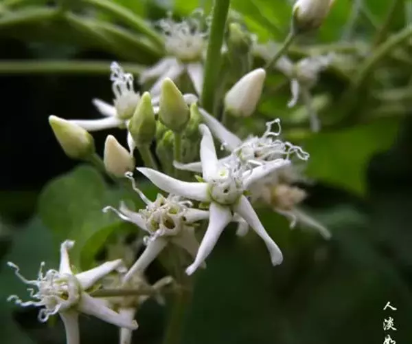 聚伞花序伞房状,着花30朵;花萼裂片卵状长圆形;花冠白色,辐状,裂片反折,内面具疏柔毛;副花冠浅杯状,裂片椭圆形,肉质,钝头,在每裂片内面的中部有1个三角形的舌状鳞片;花粉块每室1个,下垂;柱头圆锥状,顶端2裂。蓇葖双生,披针形,长8厘米,直径1厘米;种子卵状椭圆形;种毛白色绢质。花期6-9月,果期7-11月。