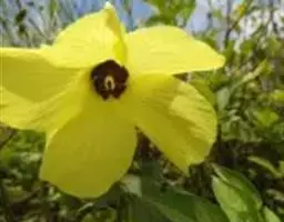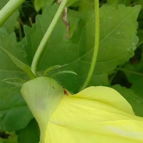 黄蜀葵,别名:秋葵、棉花葵、假阳桃、野芙蓉、黄芙蓉、黄花莲、鸡爪莲、疽疮药、追风药、豹子眼睛花、荞面花,拉丁文名:Abelmoschus manihot (Linn.) Medicus ,锦葵科、秋葵属一年生或多年生粗壮直立草本植物。茎被黄色刚毛。叶大,卵形至近圆形。花期6~8月。原产我国南方。常生于山谷草丛、田边或沟旁灌丛间。分布于印度。