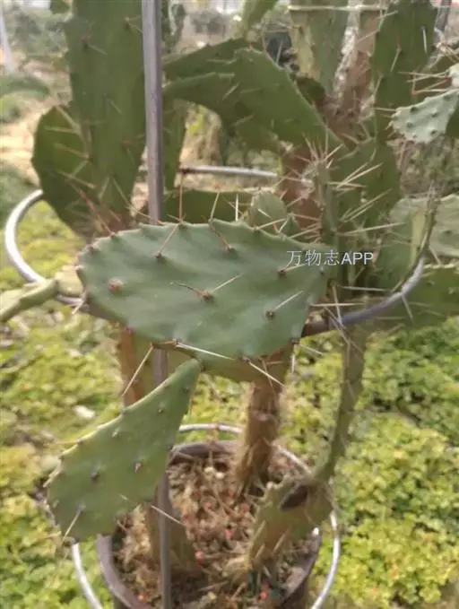 高1.3-7米,肉质灌木或小乔木,老株常具圆柱状主干。分枝多数,开展,倒卵形、倒卵状长圆形或倒披针形,长10-30厘米,宽7.5-12.5厘米,先端圆形,边缘全缘或略呈波状,基部渐狭至柄状,嫩时薄而波皱,鲜绿而有光泽,无毛,疏生小窠;小窠圆形,直径3-5毫米,具短绵毛、倒刺刚毛和刺;刺针状,单生或2(-3)根聚生,直立,长1-5厘米,灰色,具黑褐色尖头,基部直径0.2-1.5毫米,有时嫩小窠无刺,老时生刺,在主干上每小窠可具10-12根刺,刺长达7.5厘米;短绵毛灰褐色,密生,宿存;倒刺刚毛黄褐色至褐色,有时隐藏于短绵毛中。