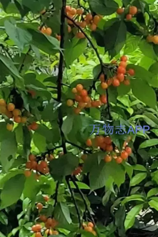 辽阳樱桃 乔木,高2-6米,树皮灰白色。小枝灰褐色,嫩枝绿色,无毛或被疏柔毛。冬芽卵形,无毛。叶片卵形或长圆状卵形,长5-12厘米,宽3-5厘米,先端渐尖或尾状渐尖,基部圆形,边有尖锐重锯齿,齿端有小腺体,上面暗绿色,近无毛,下面淡绿色,沿脉或脉间有稀疏柔毛,侧脉9-11对;叶柄长0.7-1.5厘米,被疏柔毛,先端有1或2个大腺体;托叶早落,披针形,有羽裂腺齿。