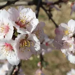 花序伞房状或近伞形,有花3-6朵,先叶开放;总苞倒卵状椭圆形,褐色,长约5毫米,宽约3毫米,边有腺齿;花梗长0.8-1.9厘米,被疏柔毛;萼筒钟状,长3-6毫米,宽2-3毫米,外面被疏柔毛,萼片三角卵圆形或卵状长圆形,先端急尖或钝,边缘全缘,长为萼筒的一半或过半;花瓣白色,卵圆形,先端下凹或二裂;雄蕊30-35枚,栽培者可达50枚。花柱与雄蕊近等长,无毛。核果近球形,红色,直径0.9-1.3厘米。花期3-4月,果期5-6月。