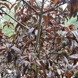 危害叶片、新梢和果实。5月上旬被侵染叶片分布有坏死的红褐色斑,随后扩大到直径4-5mm,中心部分变为浅褐色。合并的病痕形成大的死亡区域,引起早期落叶。