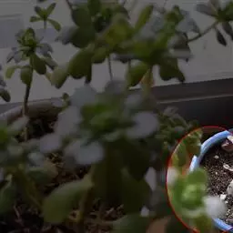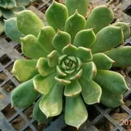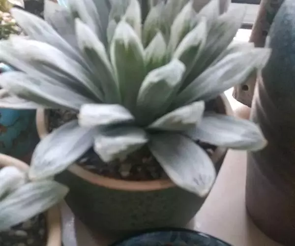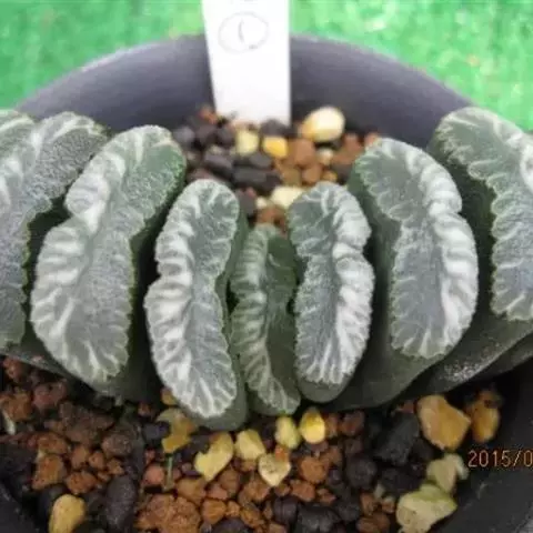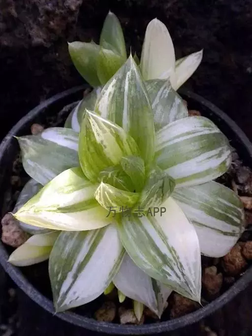 多年生肉质草本植物。株高4~5厘米,株幅6~8厘米。顶端角锥状的肉质叶,呈半透明状,碧绿色间杂镶嵌乳白色斑纹,顶端有细小的须。花序高35厘米,白花。