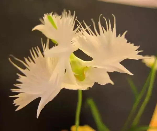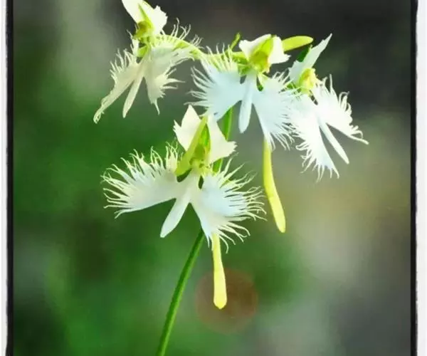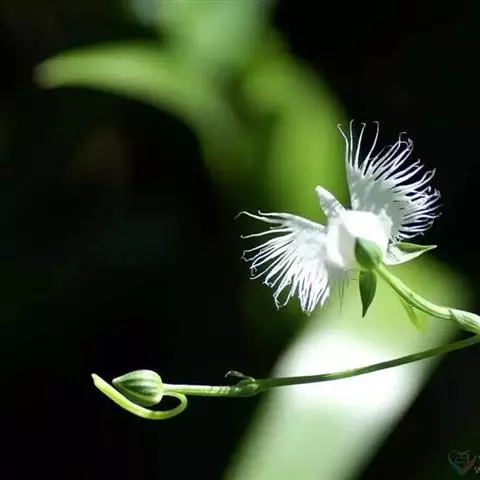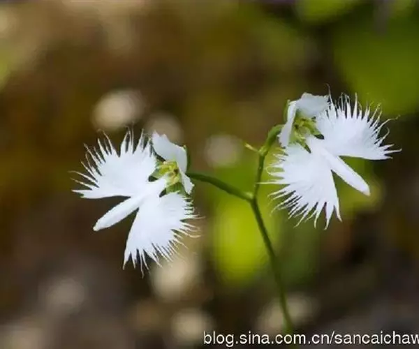 花瓣白色,斜卵形,直立,长10-12毫米,先端近急尖,外侧边缘具齿或浅的流苏,与中萼片靠合呈兜状;唇瓣白色,短楔形,长约巧毫米,3深裂;侧裂片较中裂片宽大,斜扇形,外侧边缘具长流苏状裂条,中裂片线形,长约1厘米,宽约2毫米,全缘,先端稍钝,具3脉;基部距狭圆筒状,长3-4厘米,下垂,向末端稍渐增粗。花期7-8月。