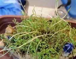 方法一 准备好兰盆及植料后,将兰株倒拿(根在上,叶在下)放于水龙头下以慢水冲洗,但水压切忌过强,以免伤兰根及叶子。用拇指和食指抓住兰头,小指抵住盆缘,用竹筷将根固定,当放入盆内时,尽量不要让根接触到盆壁。将豆粒大的混合石砾倒入盆底至三分之一处。然后倒入中粒植料至五分之四处,填实和尽量不要留下空间。将竹筷拔出,并摇实盆中植料。填实植料后,再用大粒植料埴入至距盆缘1.5厘米处。最后再倒入豆粒大植料,以将假鳞茎全部埋入土中为度,然后充分摇实。用压土工具轻压植料,并将表面弄平。种植完毕后,植料在盆中以中央稍高为好。