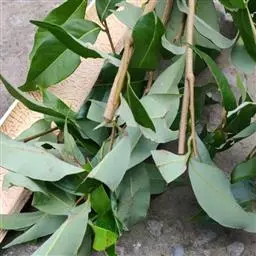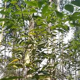 大乔木,高25米;树皮平滑,暗灰色,片状脱落,树干基部有宿存树皮;嫩枝圆形,最嫩部分略有棱。幼态叶对生,叶片阔披针形,长6-9厘米,宽2.5-4厘米;成熟叶片薄革质,狭披针形至披针形,长6-30厘米,宽1-2厘米,稍弯曲,两面有黑腺点,侧脉以45度角斜向上,边脉离叶缘0.7毫米;叶柄长1.5-2.5厘米,纤细。