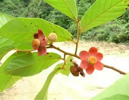 花蕾卵圆形;花淡黄色,长3.8厘米,直径与长相等或稍宽;萼片卵状椭圆形,长约5毫米,宿存;外轮花瓣厚,阔三角形,长2.5-5厘米,顶端急尖至钝,内面基部有红色小凸点,无柄,镊合状排列,内轮花瓣稍薄,卵状椭圆形,长2-3.5厘米,顶端钝,内面下半部覆盖雌雄蕊处密生小凸点,有短柄,覆瓦状排列;雄蕊长4毫米,花丝肉质,药隔膨大;心皮长5毫米,被白色绢质柔毛。