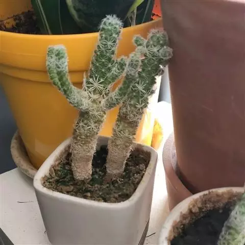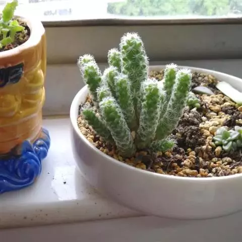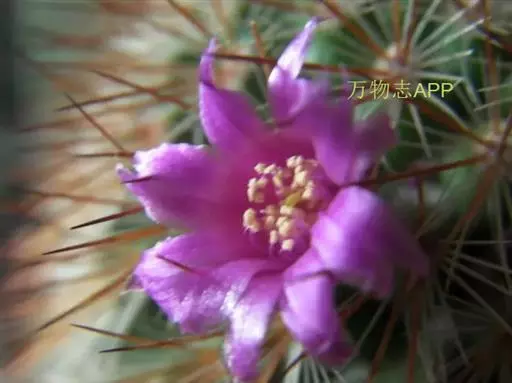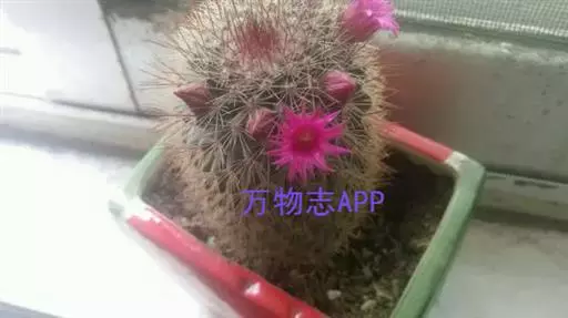 仙人掌科乳突球属,植株单生,圆筒状,高30cm,直径1Ocm。茎无白色乳汁 猩猩球 。疣突腋部有绵毛及刺毛。辐射刺20~30,常为白色,也有黄、褐或红色者;中刺7~15,针形,其中1根有钩。花浅红至紫红,直径1.5cm。
