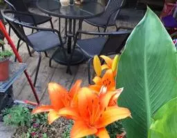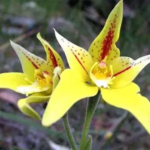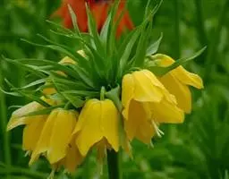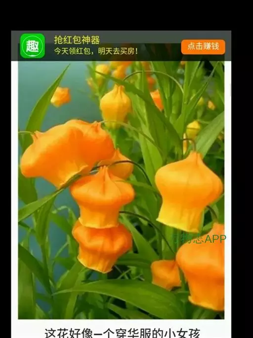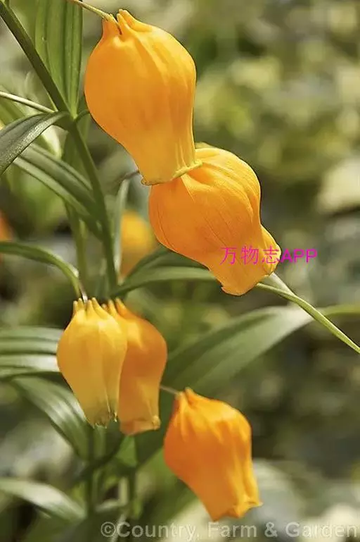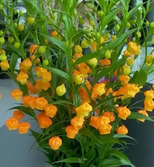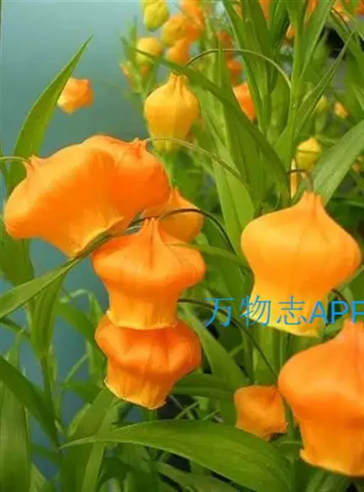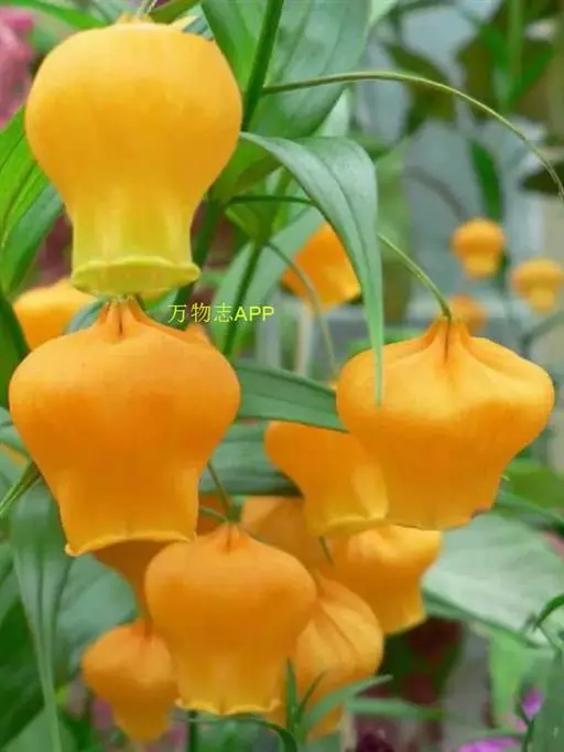 宫灯百合(学名:Sandersonia aurantiaca Hook.):仅一属一种。为多年生球根草本,由于其花形花色酷似中国宫灯而得名,多年生球根草本,半蔓性,高约1米。叶轮状互生,无柄,叶面光滑,柳叶形,长约5~10厘米,宽约2~3厘米,有3条深刻纹。 花坛状,形似宫灯,亮橙黄色,上阔下窄,宽处约2厘米,花柄约5厘米,下垂,腋生,有短裂片6,雄蕊6,花药丁字形,花柱三裂。7月~翌年1月,从仲夏到秋冬。瓶插寿命可达2~3周。蒴果3瓣,胞背开裂。