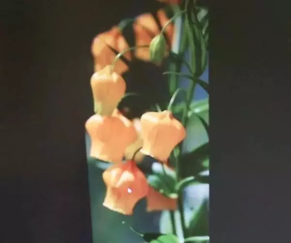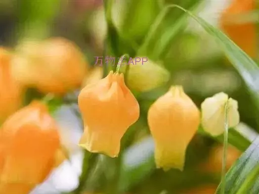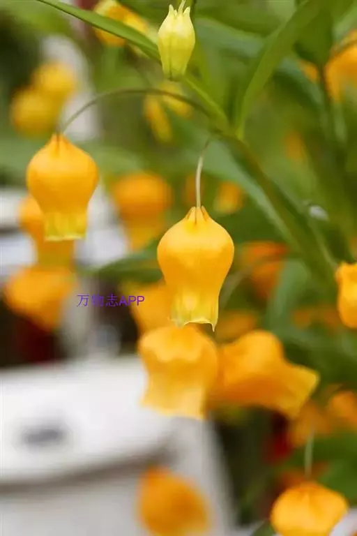 宫灯百合植株为半蔓性,高约1米。叶轮状互生,叶面光滑,柳叶形,长约5-10厘米,宽约2-3厘米,有3条深刻纹,无柄。叶轮状互生,叶面光滑,柳叶形,长约5-10厘米,宽约2-3厘米,有3条深刻纹,无柄。花似小宫灯,上大下窄,宽长约2厘米,有长柄,约5厘米,花期相当长,是仲夏至秋冬时即难得一见的奇异花卉。蒴果。喜冷凉气候,夏天时分於高海拔的冷凉地栽植,7-10月开花;平地则约於10-3月开花。
