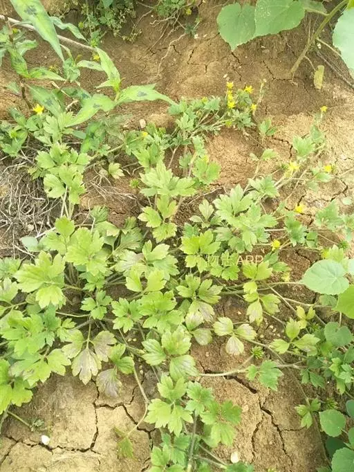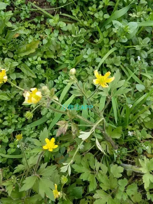 多年生草本。须根伸长簇生。茎铺散,斜升,高20-50厘米,下部节偃地生根,多分枝,密生开展的白色或淡黄色柔毛。基生叶与茎生叶相似,为3出复叶;叶片圆肾形至宽卵形,长2-5厘米,宽3-6厘米,基部心形,中央小叶宽卵形或菱状卵形,3浅裂至较深裂,边缘有锯齿,小叶柄长1-5毫米,生开展柔毛;侧生小叶不等地2裂,背面或两面疏生柔毛;叶柄长2-5厘米,密生开展的柔毛,基部扩大成褐色膜质的宽鞘抱茎上部叶较小,叶柄也较短。花与叶对生,真径1.2-1.8厘米;花梗长3-8厘米,密生柔毛;萼片狭卵形,长4-6毫米,为宽的2倍,外面生柔毛,花期向下反折,迟落;花瓣5,黄色或上面变白色,狭倒卵形至椭圆形,长6-10毫米,宽3-5毫米,有5-9条或深色脉纹,下部渐窄成长爪,蜜槽小鳞片位于爪的基部;雄蕊20余枚,花药长约2毫米;花托粗短,密生白柔毛。聚合果圆球形,直径约1厘米; 瘦果扁平,长3-4(5)米,宽3-3.5毫米,为厚的5倍以上,无毛,边缘有宽约0.4毫米的宽棱,喙长约1毫米,成锥状外弯。花果期5月至10月。