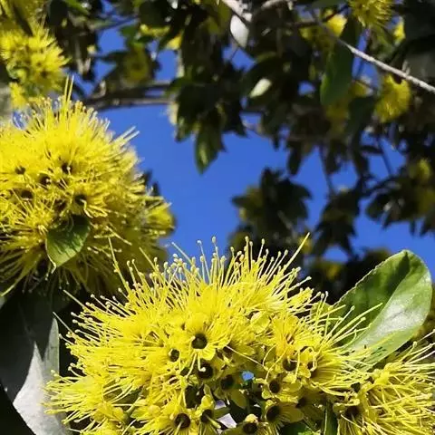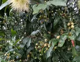 常绿乔木,高10-15米。树皮灰白而光滑;叶对生,叶片革质,卵状长椭圆形,全缘.密布油腺点,叶柄明显。叶芽顶尖,红色或粉红色;花3朵1组,圆锥花序,花瓣4片,白色而现微紫色,花萼呈筒状,顶端4裂。裂片呈三角形,鲜红色,雄蕊多数,子房下位;浆果卵圆形,红色或深紫色,内有种子1枚,呈椭圆形。花期 1-2月,果期6-7月。