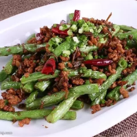 干煸豆角是用四季豆制作作为主要食材,以酱油、香油、味精、醋作为调料制作而成的一道家常菜。口味咸香辣,色泽嫩绿,口感脆嫩,营养丰富。