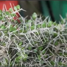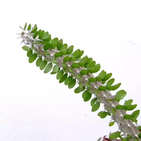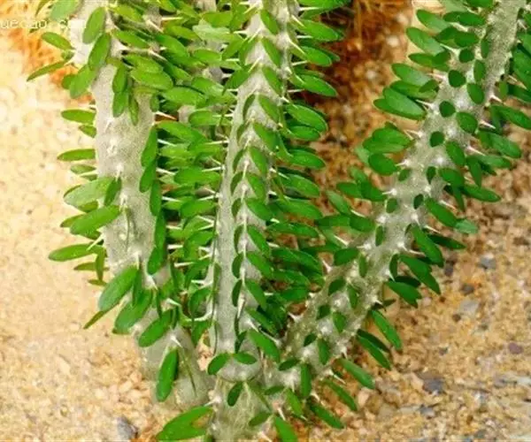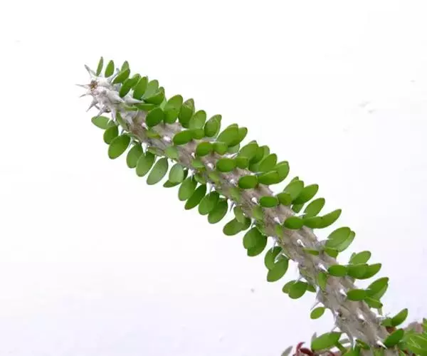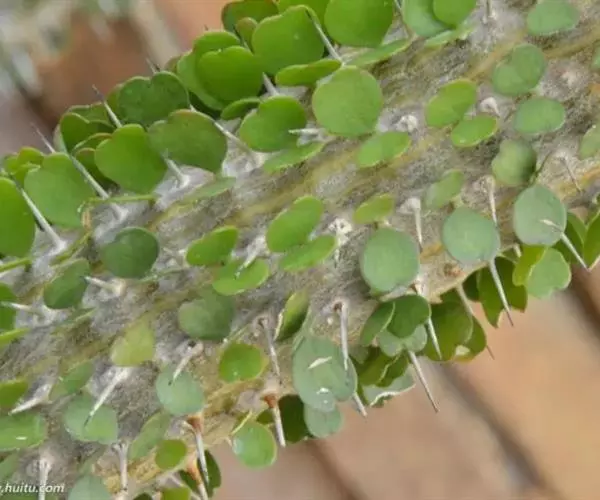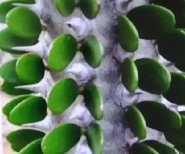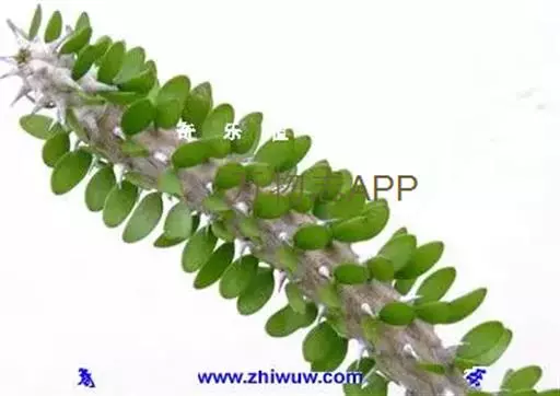 多年生常绿肉质化木本灌木或小乔木。亚龙木形态奇特,灰白色的茎干上遍布棘刺,叶片生于其间。植株在原产地可长到3~5米高,但分枝很少。茎干表皮白色至灰白色,具细锥状刺,肉质叶长卵形至心形,常成对生长,大叶绿色,小叶灰黑色。花序长30厘米左右,小花黄色或白绿色。