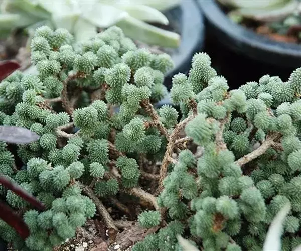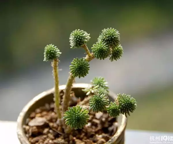 植株低矮,多分枝,株型近似球状,老茎灰白色,新枝浅绿色,以后逐渐转为灰褐色,肉质叶近似针状,但稍宽,长约1cm,簇生于枝头,绿色,老叶干枯后贴在枝干上,形成类似松树皮般的龟裂,很久才脱落,露出光滑的肉质茎。小花黄色,星状。