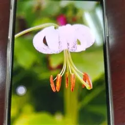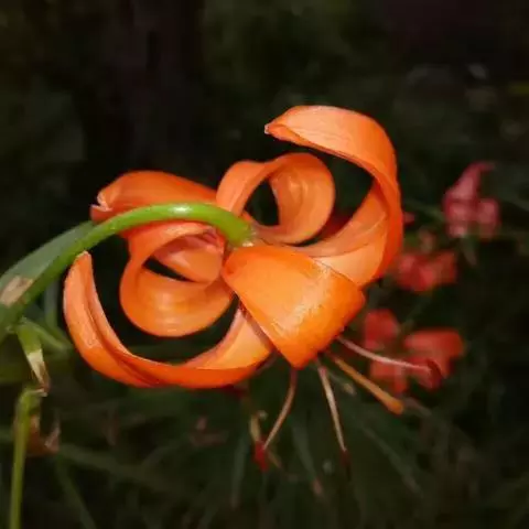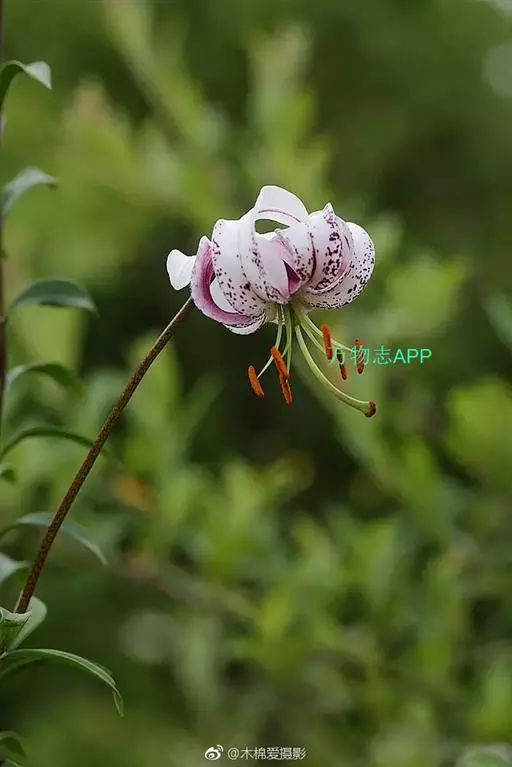 花单生或数朵排成总状花序或近伞房花序、伞形总状花序;苞片叶状,披针形,长2.5-4厘米,宽4-6毫米;花梗长10-22厘米;花下垂,有香味,白色或粉红色,有紫色斑点;花被片反卷,长4.5-6厘米,宽1.2-1.4厘米,蜜腺两边有乳头状突起;花丝长3.5厘米,无毛,花药窄矩圆形,长约1厘米,黄色;子房圆柱形,长1.2厘米,宽1.5-3毫米;花柱长为子房的2倍或更长,柱头膨大。